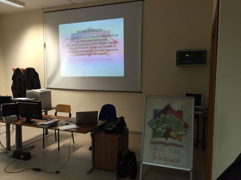 Adisu Lecce incontra gli studenti delle Scuole del Salento. Incontri di informazione e orientamento a Campi Salentina e Lecce. Nell’ambito delle proprie attività istituzionali la Sede di Lecce dell’Adisu Puglia ha avviato un programma di informazione e orientamento a una scelta universitaria consapevole e responsabile, opportunamente basata sulla buona conoscenza della realtà dei servizi disponibili per gli studenti che decidono di frequentare i corsi dell’Università del Salento. Tra questi, quelli dell’ADISU, rivestono particolare qualificazione e importanza per il rilievo diretto che hanno sulle esperienze degli studenti che sperimentano la vita di Lecce nella sua dimensione di Città Universitaria. Particolare interesse alle problematiche del Diritto allo Studio Universitario, nella sua declinazione salentina, hanno dimostrato gli studenti dl “Volta” di Campi Salentina e del “Galilei” di Lecce che hanno seguito l’illustrazione fatta dalla Dott.ssa Isabella Spalluto, Responsabile di Servizio dell’Adisu di Lecce. Con l’ausilio di supporti multimediali e telematici la dott.ssa Spalluto ha proposto un in itinerario attraverso l’architettura dei servizi offerti dall’Agenzia. Agli studenti sono stati distribuiti materiali di informazione e documentazione sulla articolata attività regionale in materia di DSU