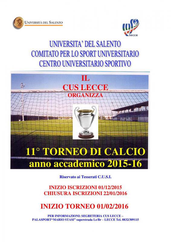 Il Centro Universitario Sportivo Lecce organizza l'11° Torneo di calcio ad undici maschile, riservato ai tesserati al CUSI per l'anno sportivo 2015/2016. Le iscrizioni sono già aperte e chiuderanno il 22 Gennaio 2016. Il torneo avrà inizio il 1° Febbraio 2016. Info presso la segreteria CUSL (Palasport universitario "Mario Stasi", superstrada LE-BR) tel. 0832309115 oppure cuslecce@libero.it