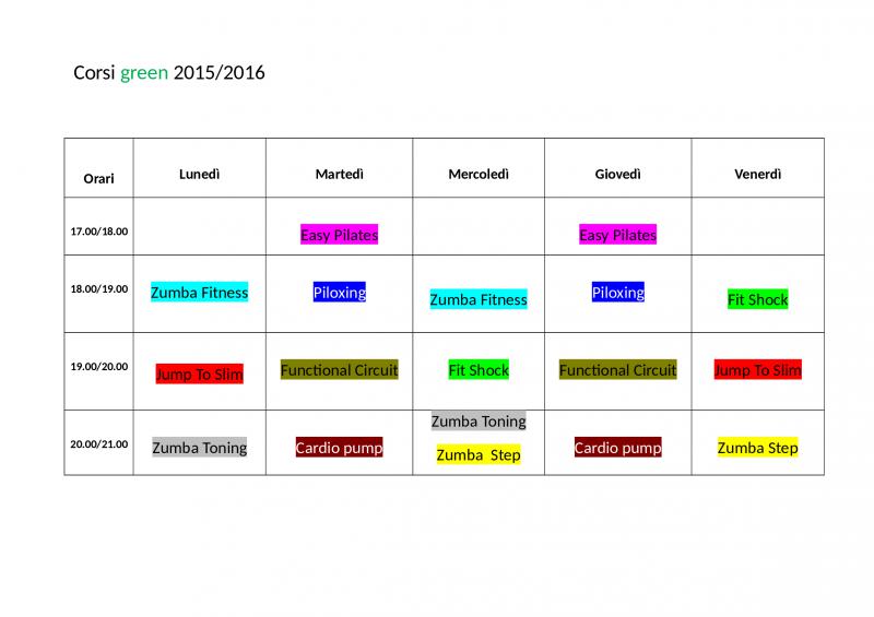 Ecco tutti i corsi green della nuova stagione... Cardio Pump: Allenamento “interval training” per tonificazione e dimagrimento, consiste in varie fasi di allenamento strutturate secondo i principi del body pump, quindi mediante l’uso di bilancieri, manubri ed elastici. Allenante per quanto riguarda la resistenza muscolare alla forza di media/lunga durata e la resistenza sia anerobica che aerobica. Easy Pilates: Il metodo easy pilates attraverso una logica successione di esercizi conduce la mente a cooperare con il corpo nella ricerca comune del controllo, della precisione e della fluidità dei movimenti, coordinandoli alla respirazione. E' adatto agli sportivi come integrazione della preparazione atletica , come ginnastica di mantenimento è adatta a tutti per il miglioramento posturale . Si avvale di oltre cinquecento esercizi, in parte a corpo libero ed in parte praticati con l'ausilio di attrezzi. Fit Shock: Un workout carico di adrenalina, dove scaricare tutte le tensioni attraverso l’utilizzo di tecniche al sacco e non, che prevedono mini coreografie con movimenti tratti dagli sport di combattimento, estremamente energetiche e potenti. Stimola l’attività cardiovascolare e brucia i grassi. Functional Circuit: Allenamento funzionale, insegna ad allenarsi rispettando la propria struttura fisica con una metodologia nuova, che prende in considerazione tutti gli aspetti del condizionamento e del movimento biomeccanico. Si effettuano esercizi che devono essere svolti in brevi ma intensi circuiti, esercizi di bilanciamento statico e dinamico che aumentano il controllo globale del corpo, movimenti a corpo libero (pushup, pullup, squat, dip ecc) con un sovraccarico naturale, esercitazioni prevalentemente cardiovascolari e allenamenti anaerobici. Jump To Slim: Un metodo di allenamento efficace e divertente, si basa sull'alternanza di stazioni aerobiche ed anaerobiche senza pause intermedie. Si effettua su trampolino elastico, tonifica la pancia, brucia calorie, rassoda gambe e braccia e ti fa scaricare al massimo, inoltre allena il cuore e aumenta il metabolismo fino a l 14 %. Scarico garantito! Piloxing: Entusiasmante programma di fitness che combina il meglio di Pilates, Boxe e Danza in un allenamento ad intervalli ad alto impatto. Unisce in modo unico la potenza, la velocità e l’agilità della Boxe attraverso colpi decisi con la flessibilità del Pilates. Tutto combinato crea un allenamento che brucia calorie, aumenta la resistenza, massimizza la salute cardiovascolare e tonifica, definendo in modo mirato la muscolatura. Zumba Fitness: I corsi di zumba® si distinguono per i ritmi esotici impartiti dai battiti super energetici della musica latino americana e internazionale. I passi base sono facili da seguire, efficaci e veramente divertenti. Zumba Step: Intensifica l'allenamento della parte inferiore del corpo e massimizza il numero di calorie bruciate. Tonifica e rafforza glutei e gambe con una miscela di passi zumba e sequenze di aerobica a prova di gravità. Zumba Toning: Ideale per scolpire il corpo in modo naturale e al contempo divertente al massimo , con l’ausilio di pesetti o sticks simili a maracas. E’ utile per aumentare ritmo e tono di tutte le zone del corpo, obiettivo in particolare braccia, addominali e cosce.