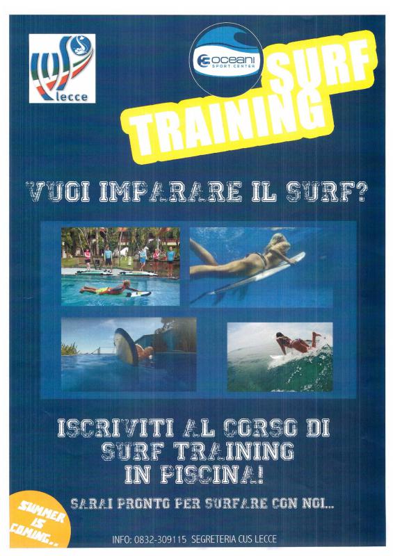 Il CUS Lecce organizza, in collaborazione con l’asd 3 Oceani Sport Center, il primo corso di SURF TRAINING in piscina. Il corso si articola in 12 lezioni, inizierà martedì 5 aprile e prevede un numero massimo di 10 partecipanti. Si rivolge a tutti quegli studenti universitari (o appartenenti alle categorie assimilate) che vogliano imparare a cavalcare l’onda e divertirsi in acqua in equilibrio su di una tavola. Il tutto in piscina, evitando i rischi di apprendere direttamente in mare i rudimenti di questo meraviglioso sport. Gli istruttori insegneranno la tecnica corretta per stare in posizione distesa e seduta sulla tavola, remare proni e manovrare per superare i frangenti e raggiungere la line up, la partenza (pop up) e tutte le tecniche per praticare il surf con sicurezza in mare.