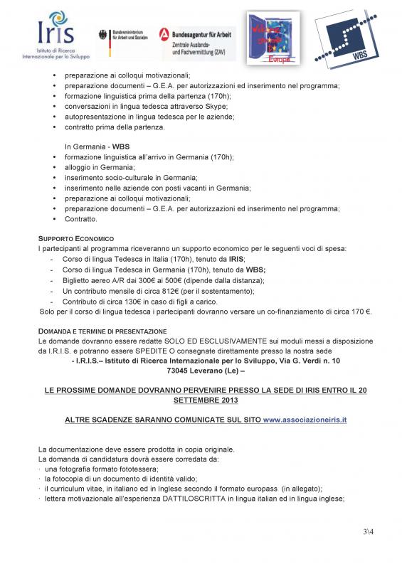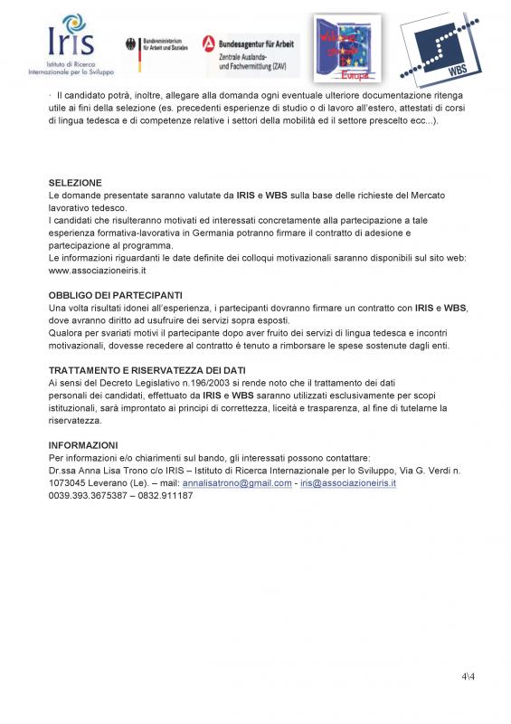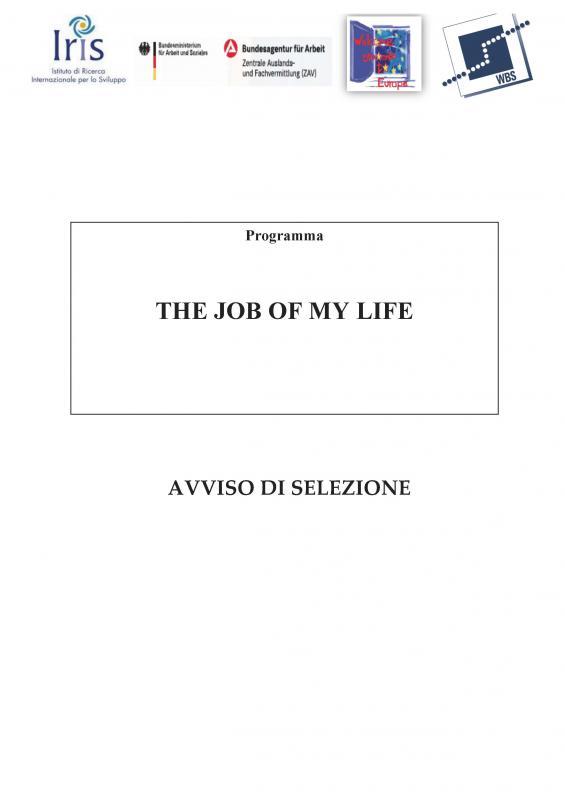 L'Associazione IRIS sta coordinando per il territorio pugliese in collaborazione con WBS il reclutamento di partecipanti al progetto "The Job of My LIfe" relativo a tirocini retribuiti in Germania. Si tratta di un' ottima opportunità in quanto i corsi di lingua tedesca, viaggi, assicurazione ed una somma forfettaria di 812€ al mese sono pagate dal programma ed i partecipanti hanno l'opportunità di sperimentarsi ed accedere nel Mercato del Lavoro europeo. GIOVANI LAUREATI IN INGEGNERIA E MEDICINA SONO LE FIGURE PROFESSIONALI MAGGIORMENTE RICHIESTE. Tutti coloro di età compresa tra i 18 ed i 35 anni, con eccezione di 40 anni per il settore sanitario, che siano interessati a partecipare possono: - visitare il sito internet http://www.associazioneiris.it/ - scrivere agli indirizzi di posta elettronica: iris@associazioneiris.it / annalisatrono@gmail.com - telefonare al numero 0039.393.3675387.