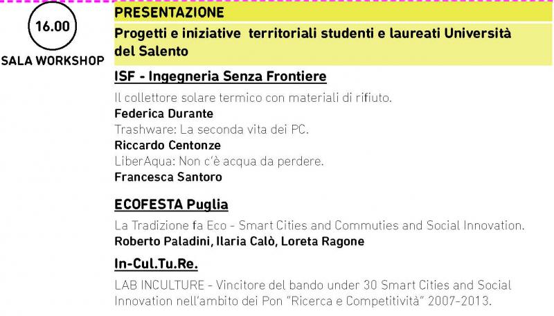 Presentazione progetti ed iniziative studenti ISF – Ingegneria Senza Frontiere Presentazione di ISF – Alessandro Severini Trashware: La seconda vita dei PC - Alessandro Severini Il collettore solare termico con materiali di rifiuto – Federica Durante LiberAqua: Non c’è acqua da perdere – Francesca Santoro Ecofesta La Tradizione fa Eco – Smart Cities and Commuties and Social Innovation Roberto Paladini, Ilaria Calò, Loreta Ragone In-Cul.Tu.Re. LAB INCULTURE - vincitore del bando under 30 Smart Cities and Social Innovation nell’ambito dei Pon “Ricerca e Competitività” 2007-2013