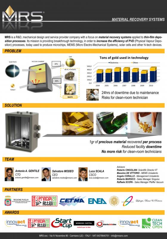 MRS è una società di progettazione di sistemi e processi per il recupero di materiali metallici (in particolare metalli preziosi come oro, platino e palladio) utilizzati in tecnologie di deposizione di film sottile, caratterizzati da enormi sprechi di materiali e complicate procedure di manutenzione. Tali processi sono molto diffusi nelle applicazioni industriali come microelettronica, solare, ottica, meccanica, etc. . http://www.mrssnc.com