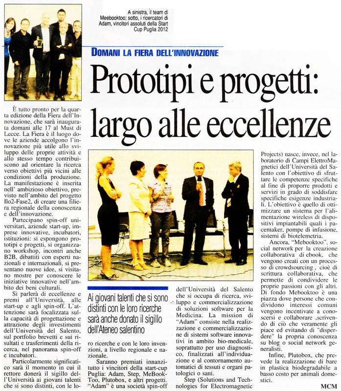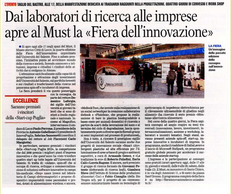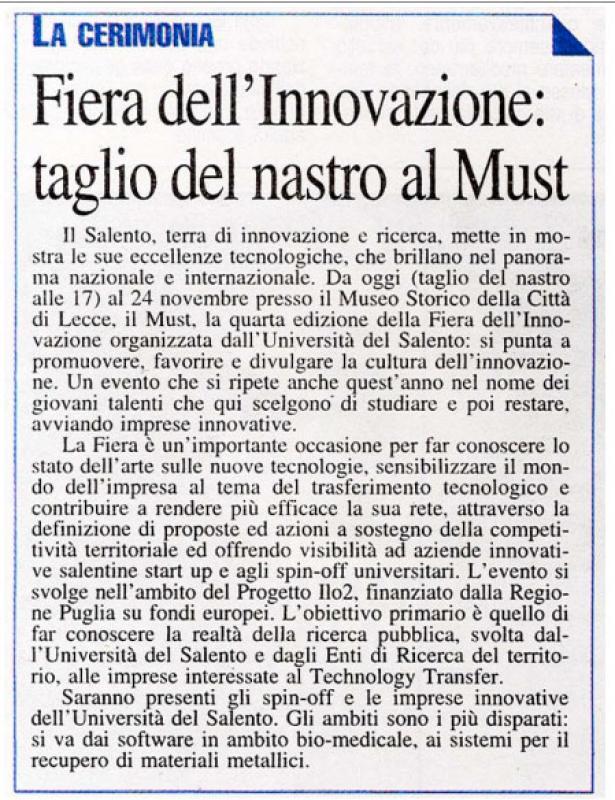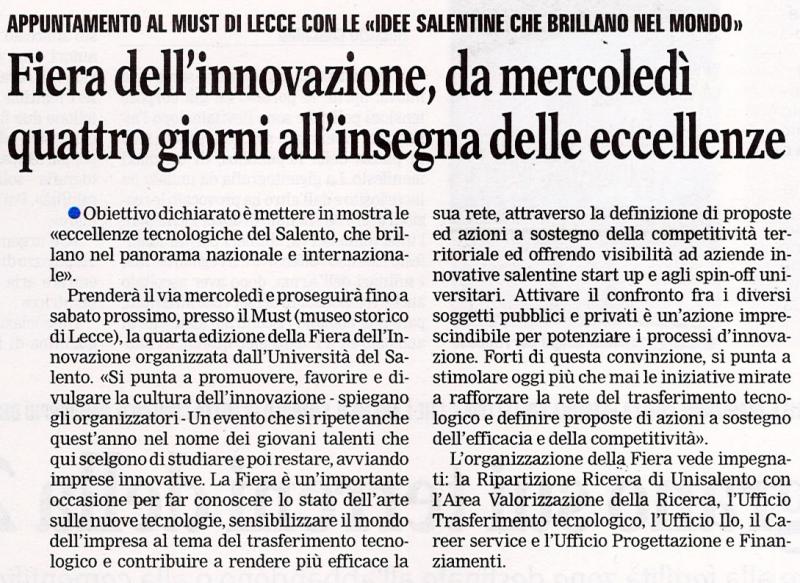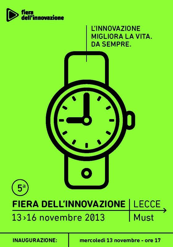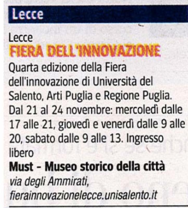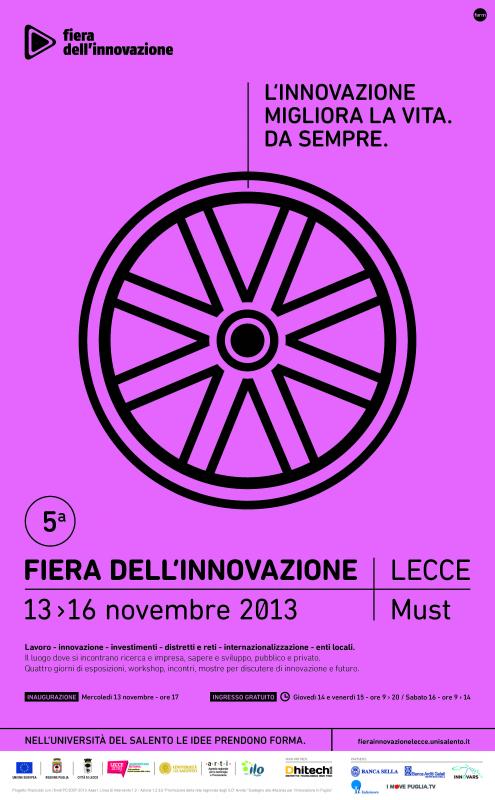 Ha inizio mercoledì 13 novembre, alle ore 17:00, presso il Museo Storico della Città di Lecce, il MUST (ex Monastero Santa Chiara), la 5a edizione della Fiera dell’Innovazione organizzata dall'Area Valorizzazione della Ricerca dell'Università del Salento e finanziata da Regione Puglia con i fondi PO 2007-2013. Asse I. Linea di Intervento 1.2 - Azione 1.2.3.b "Promozione della rete regionale degli ILO" Avviso "Sostegno alle Alleanze per l'Innovazione in Puglia”. Un evento che si ripete anche quest’anno nel nome di giovani talenti che nel nostro territorio scelgono di studiare, restare ed avviare imprese (start up/spin off) innovative. Incubatori, ricerca d’impresa, living labs, smart cities & communities, spin off/start-up, questi i 5 temi su cui si è costruita l’edizione 2013 della Fiera dell’Innovazione. Sito Web: http://fierainnovazionelecce.unisalento.it/ Facebook: www.facebook.com/fieradellinnovazione Twitter: https://twitter.com/fierainnovazion