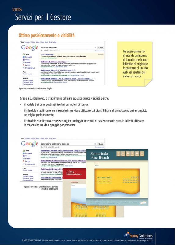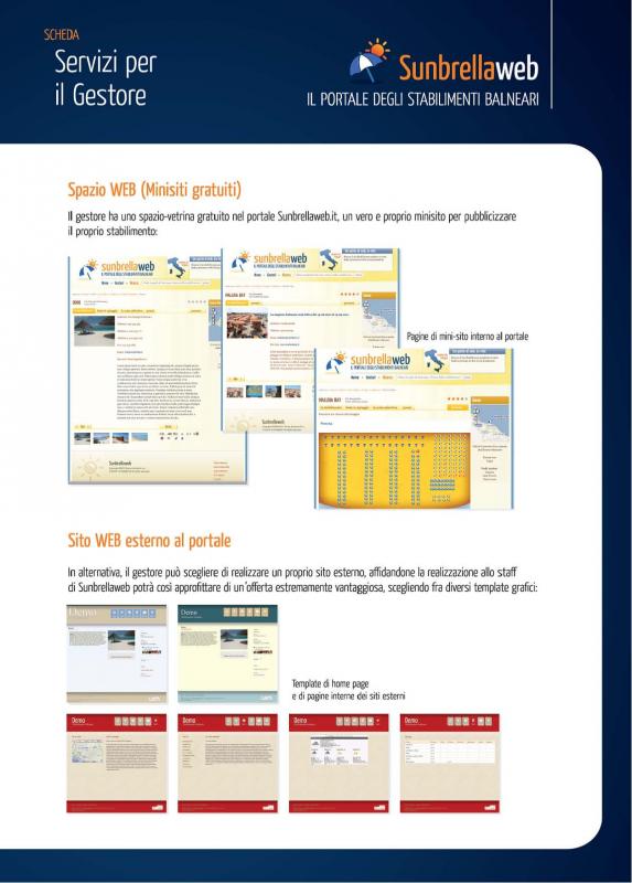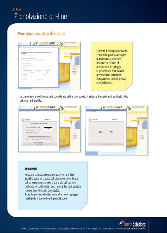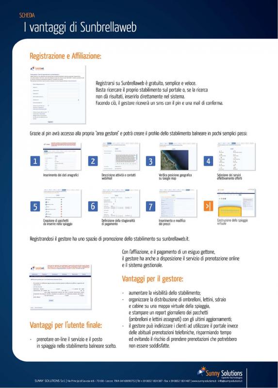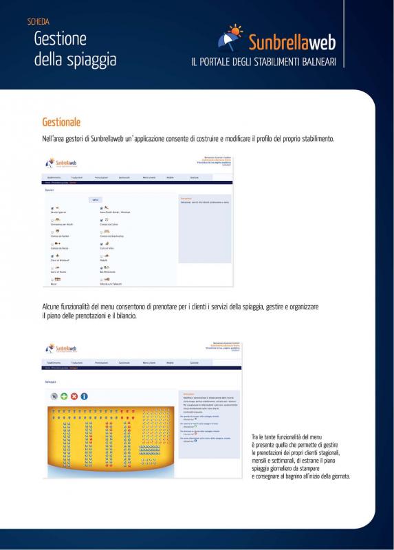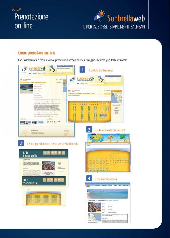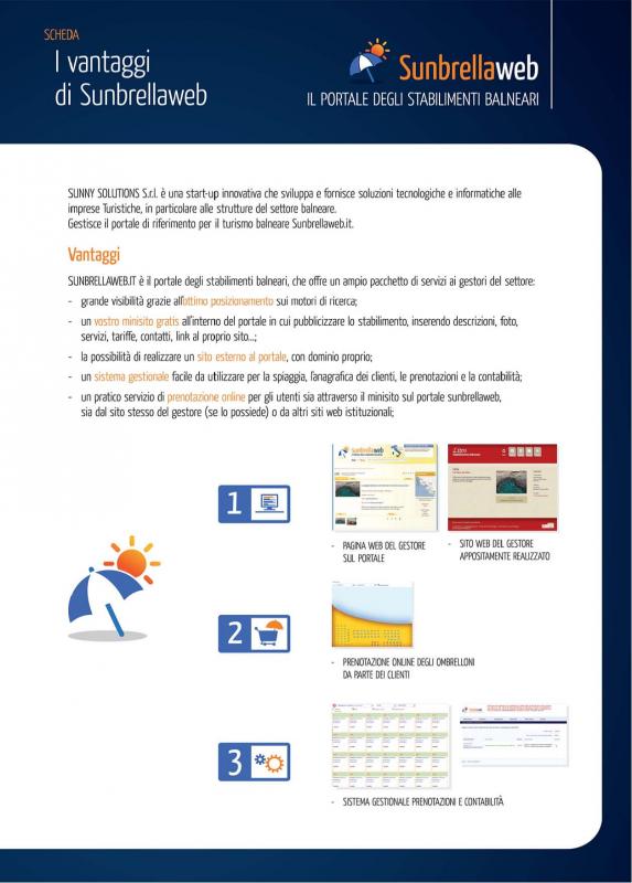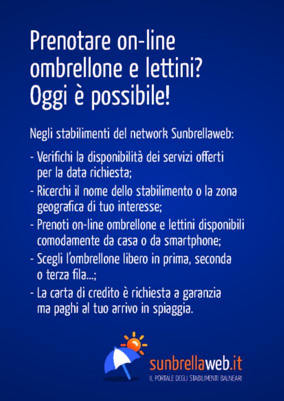 Con Sunbrellaweb l’ombrellone si prenota online! Da oggi il nuovo portale Sunbrellaweb.it e l’app per iPhone permettono di prenotare comodamente da casa l’ombrellone nella spiaggia preferita, in tutta Italia. Sunbrellaweb.it fornisce al visitatore tutte le informazioni necessarie per scegliere, visualizzando le foto, i servizi disponibili e i prezzi praticati, lo stabilimento balneare dove passare una giornata o più giorni di vacanza in spiaggia. Il portale permette di prenotare l’ombrellone direttamente online tramite una mappa interattiva che il gestore della spiaggia configura a inizio stagione coerentemente con la disposizione dei propri ombrelloni sull’arenile o area demaniale in concessione.