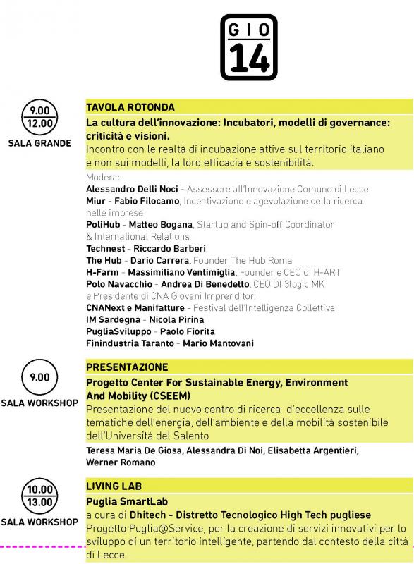 ORE 9.00 - Presentazione Progetto Center For Sustainable Energy, Environment And Mobility (CSEEM) – Presentazione del nuovo centro di ricerca d’eccellenza sulle tematiche dell’energia, dell’ambiente e della mobilità sostenibile dell’Università del Salento. Ing. Teresa Maria De Giosa - Ing. Alessandra Di Noi - Ing. Elisabetta Argentieri - Ing. Werner Romano ORE 10.00 – 13.00 - Living Lab Presentazione di Puglia SmartLab, Living Lab creato da Dhitech – Distretto Tecnologico High Tech pugliese – progetto Puglia@Service, per la creazione di servizi innovativi per lo sviluppo di un territorio intelligente, partendo dal contesto della città di Lecce.