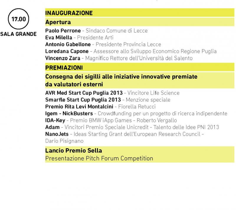 Premiazioni Consegna dei sigilli alle iniziative innovative premiate da valutatori esterni > AVR Med Start Cup Puglia 2013 – Vincitore Life Science > Smarfle – Start Cup Puglia 2013 > Fiorella Retucci – Premio Rita Levi Montalcini > Igem – NickBusters crowdfunding per un progetto di ricerca indipendente > Roberto Vergallo – IDA-Key – Premio BMW i App Games > Adam – Vincitori Premio Speciale Unicredit – Talento delle Idee PNI 2013 > Dario Pisignano – NanoJets – Ideas Starting Grant dell’European Research Council Lancio Premio Sella – Pitch Forum Competition