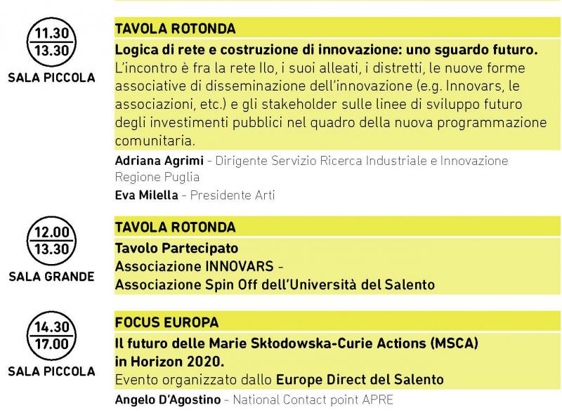 ORE 11.30 – 13.30 - Tavola Rotonda - Sala Piccola LOGICA DI RETE E COSTRUZIONE DI INNOVAZIONE: UNO SGUARDO AL FUTURO L’incontro è fra la rete Ilo, i suoi alleati, i distretti, le nuove forme associative di disseminazione dell’innovazione (e.g. Innovars, le associazioni, etc…) e gli stakeholder sulle linee di sviluppo futuro degli investimenti pubblici nel quadro della nuova programmazione comunitaria. Dott.ssa Adriana Agrimi Dirigente Servizio Ricerca Industriale e Innovazione Regione Puglia - Dott.ssa Eva Milella Presidente Arti - Referenti Ilo Pugliesi – Distretti e reti ORE 12.00 – 13.30 - Tavolo Partecipato - Sala Grande Associazione INNOVARS – Associazione Spin Off dell’Università del Salento