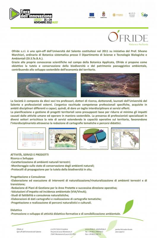 Ofride s.r.l. è uno spin-off dell’Università del Salento costituitosi nel 2011 su iniziativa del Prof. Silvano Marchiori, ordinario di Botanica sistematica presso il Dipartimento di Scienze e Tecnologie Biologiche e Ambientali (Di.S.Te.B.A.). Grazie alle proprie conoscenze scientifiche nel campo della Botanica Applicata, Ofride si propone come obiettivo la tutela e conservazione della biodiversità e del patrimonio paesaggistico ambientale, contribuendo allo sviluppo sostenibile dell’economia del territorio. Riferimento stand nella Fiera: STAND 11