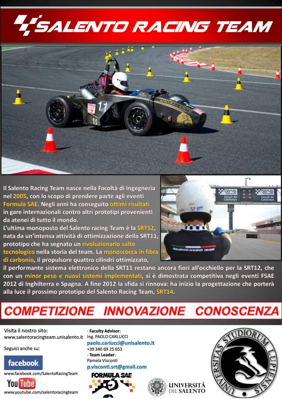 Il Salento Racing Team nasce nella Facoltà di Ingegneria dell’Università del Salento nel 2005 con lo scopo di partecipare agli eventi Formula SAE. Ha permesso a oltre 100 studenti dell’Università del Salento di partecipare a questo tipo di esperienza. Il docente di riferimento del progetto è l’Ingegner Paolo Carlucci, professore aggregato in Sistemi Energetici e dell’Ambiente presso la Facoltà di Ingegneria. Il Salento Racing Team rappresenta, oggi, una solida realtà all’interno dell’Ateneo. Grazie al sostegno delle strutture universitarie (Consiglio degli Studenti, Consigli di Facoltà e Consigli Didattici), al supporto di partner tecnici e sponsor qualificati e al lavoro costante e appassionato di un gruppo di circa 30 studenti, il team porta il buon nome dell’Università del Salento in giro per il mondo, in competizioni di alto livello, rappresentando degnamente l’eccellenza e la qualità della preparazione fornita dai vari corsi di studio e l’immagine di assoluto prestigio dell’Ateneo stesso.