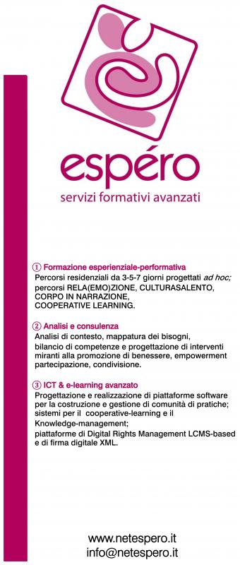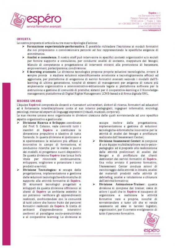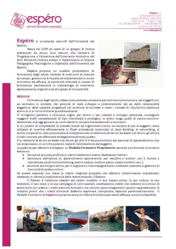 ESPÉRO S.R.L. Sede legale Via Stampacchia 45/47 – Palazzo Parlangeli 39/C 73100 Lecce Ref. Ing. Maria Grazia Celentano Email: mariagrazia.celentano@netespero.it Sito web: www.netespero.it Cell: 3406525700