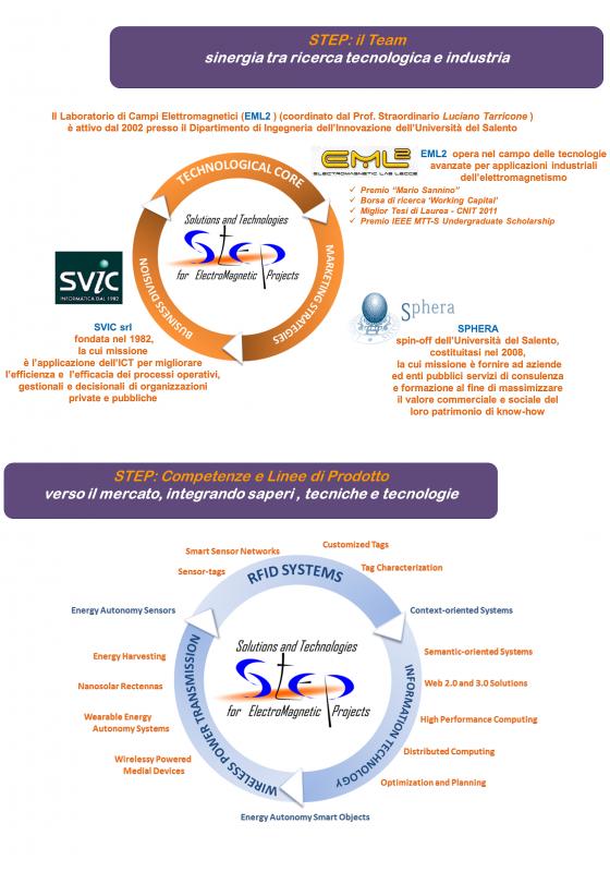 La compagine sociale della costituenda S.T.E.P., una spin-off partecipata dall’Università del Salento, si compone, oltre all’Università, di sei soci tra cui un team di quattro ricercatori dell’Università del Salento e due aziende. Il team di quattro ricercatori svolge attività di ricerca nel settore delle tecnologie elettromagnetiche presso il Laboratorio di campi EM (EML2) attivo dal 2002 presso il Dip. di Ing. Dell’Innovazione dell’Univ. del Salento. Del team fanno parte: il Prof. Straordinario Luciano Tarricone (fondatore dell’EML2 e coordinatore del gruppo di Campi EM dell’Univ. Del Salento), il Ricercatore Luca Catarinucci (che coordina le attività dell’EML2 inerenti i sistemi di identificazione a radiofrequenza-RFID e la loro applicazione in ambito industriale), e due assegniste di Ricerca, l’Ing. Giuseppina Monti (che coordina le attività inerenti lo sviluppo di tecnologie per la trasmissione di potenza wireless ed applicazioni di riciclo dell’energia) e l’Ing. Alessandra Esposito (che coordina le attività del gruppo inerenti l’applicazione di tecnologie informatiche avanzate).