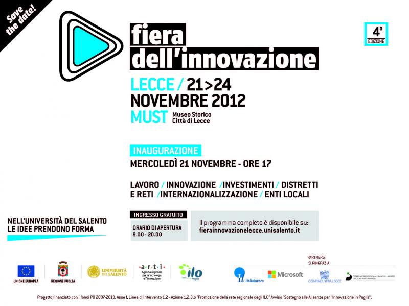 ORE 15.00 > Must, Sala 1 Convegno Innovazione e lavoro > Nuove figure ed opportunità: come l’innovazione cambia il mercato del lavoro, gli strumenti necessari per lo sviluppo degli innovatori. Le nuove opportunità di lavoro offerte dall’innovazione e gli strumenti che il mercato del lavoro deve offrire per promuovere lo sviluppo dell’innovazione. Coordinamento: Adelmo Gaetani Partecipano Annibale D’Elia – Coordinatore Bollenti Spiriti e componente task force Ministro Passera per il Decreto Crescita 2.0 Antonella Bisceglia – Regione Puglia, Direttrice Area Politiche per lo sviluppo economico, lavoro e innovazione Ernesto Toma – Provincia di Lecce, Assessore Formazione professionale e politiche del lavoro Francesco Coppola – Osseravatorio Banche Imprese di Economia e Finanza, Coordinatore Comitato Scientifico