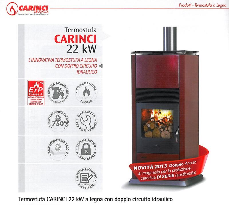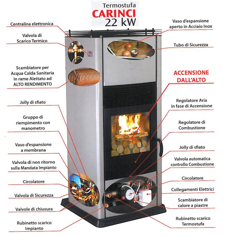 NUOVA TERMOSTUFA CARINCI 22 KW A LEGNA CON DOPPIO CIRCUITO IDRAULICO La Termostufa Carinci è l’unica che si può accendere dall’alto garantendo in questo modo un’autonomia di riscaldamento per diverse ore con una sola carica di legna riducendo drasticamente i consumi, tale sistema favorisce la corretta combustione della legna riducendo al minimo le fumosità e di conseguenza le emissioni di CO rendendo ancor più ecologica la combustione della Termostufa CARINCI.