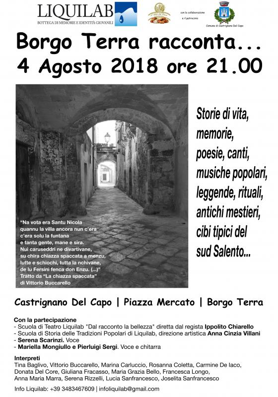 Sabato 4 Agosto alle ore 21 a Castrignano Del Capo, all’interno del nucleo più antico, Borgo Terra racconterà storie di vita, poesie, canti e musiche popolari, leggende, macare, antichi mestieri del sud Salento…