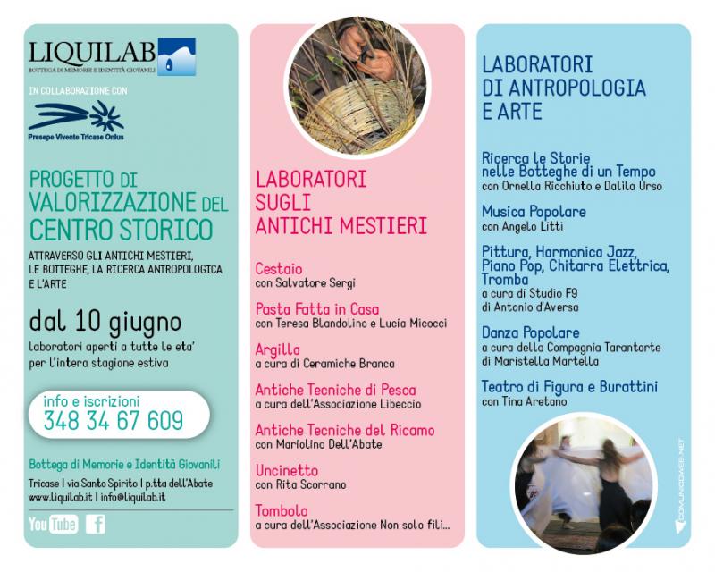 Liquilab in collaborazione con il Comitato Presepe Vivente avvia il progetto di valorizzazione del Centro Storico di Tricase attraverso gli antichi mestieri, le botteghe, le case a corte, la ricerca antropologica e l’arte. Il progetto prevede per la stagione estiva, dal 10 Giugno al 14 Settembre 2014, l’attivazione di un mosaico di laboratori sugli antichi mestieri legati alle tradizioni del territorio in cui sono coinvolti gli artigiani locali, le associazioni e la gente del posto, artisti e antropologi. I laboratori sono aperti a tutte le età in un’ottica di scambio fra le diverse generazioni; infatti il nostro approccio non è esclusivamente didattico, ma intende trasmettere la microstoria locale, le identità territoriali, le tradizioni e i valori di un tempo. Informazioni: Liquilab 348 3467609