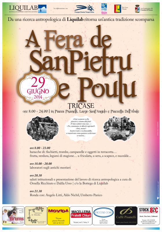 Da una ricerca antropologica, LIQUILAB - in collaborazione con il Comitato Presepe Vivente, la Pro Loco di Tricase, il GAL Capo S.Maria di Leuca e con il patrocinio della Città di Tricase - ripropone l'antica "Fera de San Pietru e Poulu" DOMENICA 29 GIUGNO 2014 dalle ore 8:00 alle ore 24:00.