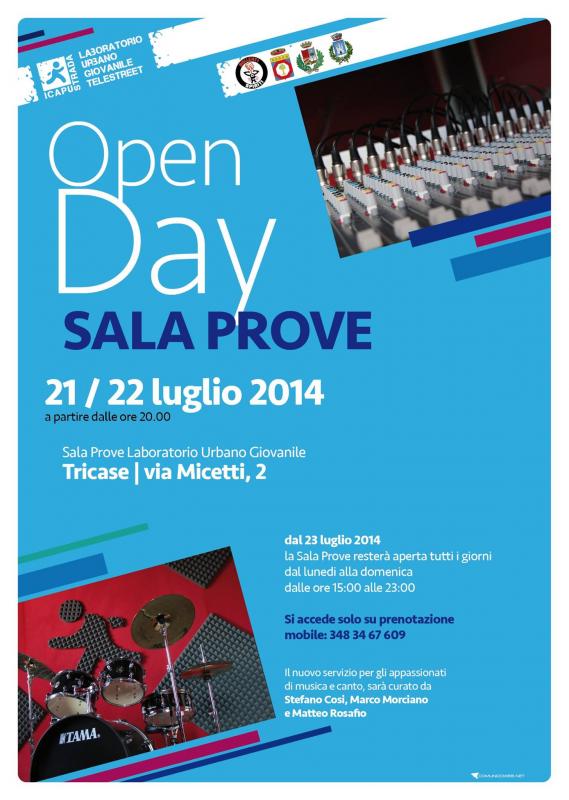 21 e 22 Luglio a partire dalle ore 20.00 presso il Laboratorio Urbano Giovanile di Tricase sopra alla biblioteca comunale in via Micetti ci sarà l'open day della sala prove de "i CapuStrada", aperta a tutti i musicisti e cantanti per provare gratuitamente e promuovere la propria musica. Vi aspettiamo numerosi