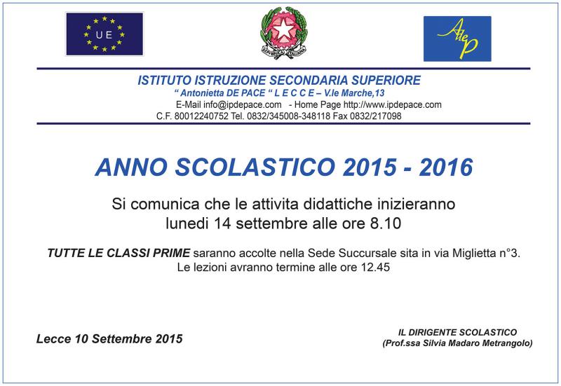 Cambio della dirigenza scolastica all’Istituto d’Istruzione Secondaria Superiore “A. De Pace” di Lecce. Assume il prestigioso incarico la professoressa Silvia Madaro Metrangolo. In occasione del suo insediamento, la professoressa Silvia Madaro Metrangolo ha voluto esprimere un doveroso ringraziamento alla Preside Antonaci per la grande competenza dimostrata nel dirigere un istituto complesso come il De Pace e dare il suo saluto: “Solo molto orgogliosa di ricoprire questo incarico perché il De Pace è un Istituto molto importante per il nostro territorio” - ha dichiarato la nuova dirigente scolastica durante il suo primo incontro con i docenti. “Gli alunni, le famiglie, le Istituzioni si aspettano molto da noi. Ci attiveremo al massimo per essere all’altezza del compito che ci è stato affidato. I nostri sguardi, le nostre attenzioni saranno sempre rivolte agli alunni, alle loro aspettative, ai loro bisogni. Li comprenderemo e li aiuteremo a crescere, per giungere alla loro piena realizzazione umana e professionale ”.