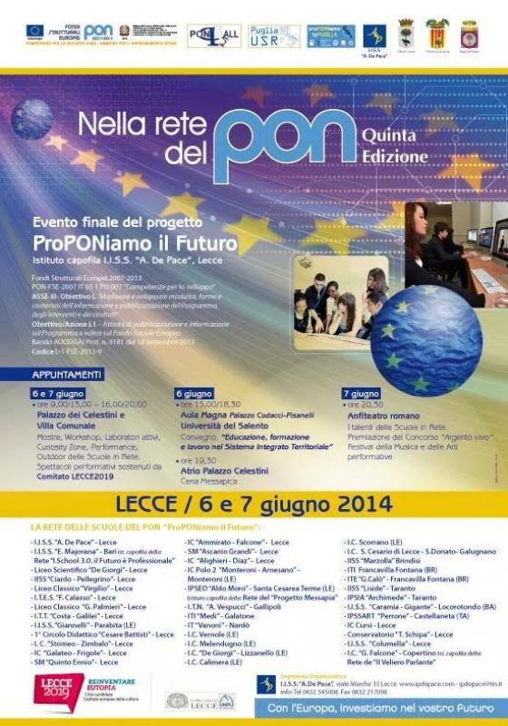 6 -7 giugno ore 9.00/13.00 e 16.00/20.00: Palazzo dei Celestini e Villa Comunale Mostre, workshop, laboratori attivi, curiosity zone, performance, outdoor delle Scuole in Rete. Spettacoli performativi sostenuti da Comitato Lecce2019 6 giugno ore 15.00/18.30: Aula Magna Codacci Pisanelli Università del Salento - Convegno “Educazione, formazione e lavoro nel sistema integrato territoriale. Un modello: il Polo Tecnico Professionale Regionale ARTIS” ore 19.30: Atrio Palazzo dei Celestini "Cena Messapica" 7 giugno ore 20.30: Anfiteatro Romano - I Talenti delle Scuole in Rete; Premiazione del concorso "Argento vivo"; Festival della Musica e delle Arti Performative