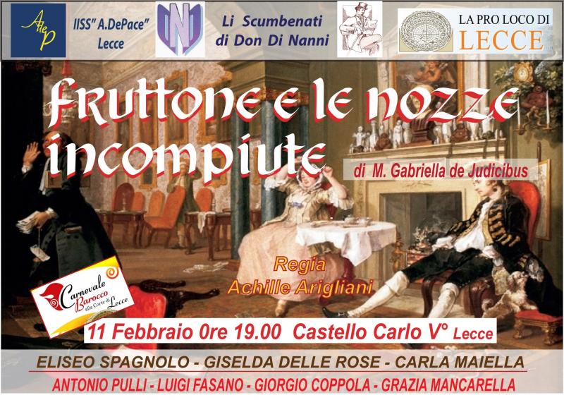 Fruttone e le nozze incompiute Lecce 11 Febbraio 2013 Ore 19.00 Castello Carlo V° CARNEVALE BAROCCO ALLA CORTE DI LECCE TUTTI COLORO CHE VOGLIONO PARTECIPARE ALLA SFILATA IN MASCHERA POSSONO RAGGIUNGERCI ALLE ORE 16.00 PRESSO LA SEDE DELL'IISS "A. DE PACE" IN VIA MIGLIETTA DOVE PRESSO GLI ATELIEURS D'ISTITUTO SONO A DISPOSIZIONE GLI ABITI PER I GRUPPI MASCHERATI O POSSONO RAGGIUNGERCI AL CASTELLO DI CARLO V PRIMA DELLE 18.00, ORA IN CUI IL CORTEO SI MUOVERA' ALLA VOLTA DI PIAZZA MAZZINI. SI CONTA DI RIENTRARE AL CASTELLO ENTRO E NON OLTRE LE ORE 20.00. Per partecipare o per altre informazioni, scriveteci: laprolocodilecce@libero.it