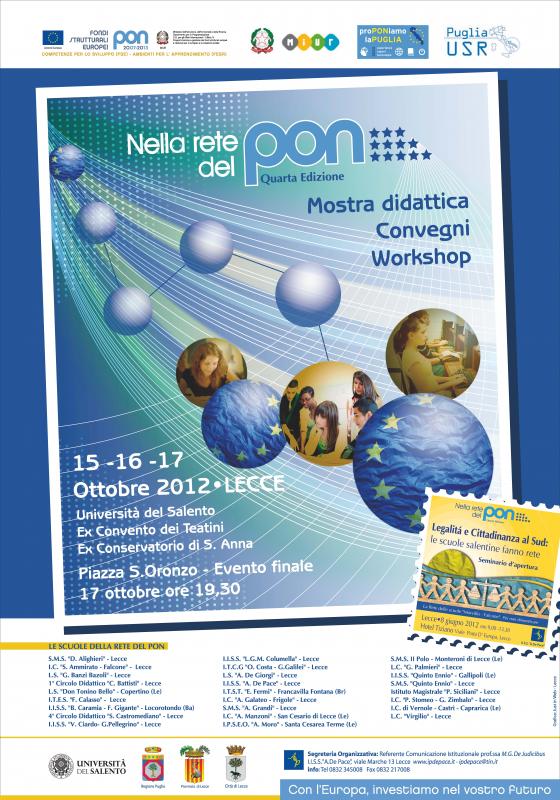 L'Istituto è stato lieto di invitarvi alla quarta edizione dell'evento "Nella Rete dei PON" che si è tenuta nei giorni 15 -16 -17 ottobre 2012 Tre giornate dedicate alla diffusione ed alla pubblicizzazione dei prodotti delle scuole salentine con le risorse dei Fondi FSE e FESR (Programma “ Nella Rete del PON III” - Cod. L-1-FSE-2011-41) Il ricco programma è consultabile sul sito scolastico: www.ipedpace.com La serata conclusiva in P.zza S.Oronzo a Lecce! Buon divertimento!!!