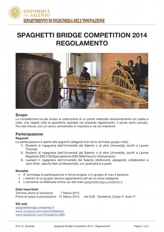 Arriva la #SpaghettiBridge 2014, organizzata da #Unisalento. Studenti di ingegneria di tutta Italia, il vostro momento è arrivato! Riuscirete a costruire un ponte realizzato esclusivamente con pasta e colla ?!? Il dado è tratto, c'è tempo fino al 7 MARZO per iscriversi! La Spaghetti Bridge Competition è in programma il 21.03.2014 in aula Y1 Corpo Y