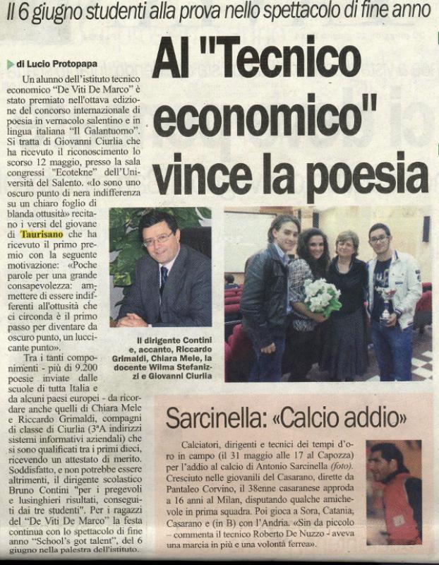 “Il GALANTUOMO” ,concorso nazionale, ha premiato l’ITE DEVITI DEMARCO per la partecipazione e ha conferito il PRIMO PREMIO, per la categoria” scuole secondarie superiori” all’alunno GIOVANNI CIURLIA frequentante la classe 3^ A SIA del DE VITI DE MARCO. Un attestato di partecipazione è stato conferito a MELE CHIARA e GRIMALDI RICCARDO anche loro frequentanti la 3^ A SIA.