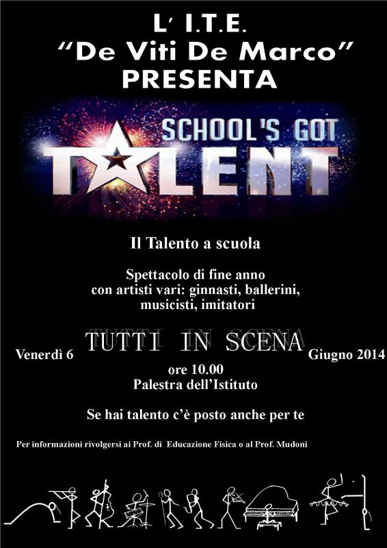 Spettacolo di fine anno con artisti vari: ginnasti, ballerini, musicisti, imitatori. Venerdì 6 Giugno 2014 ore 10.00 Palestra dell’Istituto Se hai talento c'è posto anche per te Per informazioni rivolgersi ai Prof. di Educazione Fisica o al Prof. Mudoni