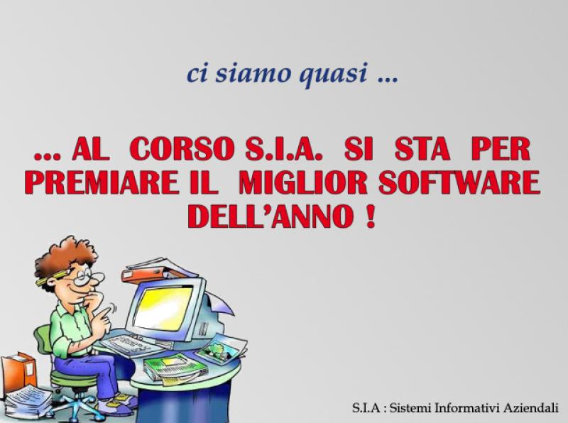Il concorso “Miglior software dell’anno” prevede che in ciascuna classe terza e quarta del corso S.I.A. (Sistemi Informativi Aziendali) nell’ultima assemblea di classe del mese di maggio si elegga quello che a maggioranza gli alunni riterranno il miglior software prodotto nel corso dell’anno scolastico durante le esercitazioni di laboratorio di Informatica.