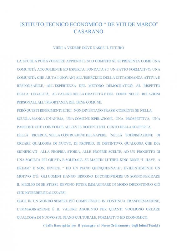 LA SCUOLA PUÒ SVOLGERE APPIENO IL SUO COMPITO SE SI PRESENTA COME UNA COMUNITÀ ACCOGLIENTE ED ESPERTA, FONDATA SU UN PATTO FORMATIVO; UNA COMUNITÀ CHE AIUTA I GIOVANI ALL’ESERCIZIO DELLA CITTADINANZA ATTIVA E RESPONSABILE, ALL’ESPERIENZA DEL METODO DEMOCRATICO, AL RISPETTO DELLA LEGALITÀ, AL VALORE DELLA GRATUITÀ E DEL DONO NELLE RELAZIONI PERSONALI, ALL’IMPORTANZA DEL BENE COMUNE. PERÒ QUESTI RIFERIMENTI ETICI NON DIVENTANO PRASSI COERENTE SE NELLA SCUOLA MANCA UN'ANIMA, UNA COMUNE ISPIRAZIONE, UNA PROSPETTIVA, UNA PASSIONE CHE COINVOLGE ALLIEVI E DOCENTI NEL GUSTO DELLA SCOPERTA, DELLA RICERCA, NELLA COSTRUZIONE DEL SAPERE, NELLA SODDISFAZIONE DI CREARE QUALCOSA DI NUOVO, DI PROPRIO, DI DISTINTIVO; QUALCOSA CHE DIA SIGNIFICATI ALLA PROPRIA STORIA, ALLE PROPRIE SCELTE, AD UN PROGETTO DI UNA SOCIETÀ PIÙ GIUSTA E SOLIDALE. SE MARTIN LUTHER KING DISSE “I HAVE A DREAM” E NON, INVECE, “ HO UN PIANO QUINQUENNALE”, EVIDENTEMENTE UN MOTIVO C’È: GLI UOMINI HANNO BISOGNO DI CONDIVIDERE UN SOGNO PER DARE IL MEGLIO DI SE STESSI, DEVONO POTER IMMAGINARE IN MODO DISCONTINUO CIÒ CHE POTREBBE REALIZZARSI. OGGI, IN UN MONDO SEMPRE PIÙ COMPLESSO E IN CONTINUA TRASFORMAZIONE, L’IMMAGINAZIONE È IL VALORE AGGIUNTO PER QUANTI VOGLIONO CREARE QUALCOSA DI NUOVO SUL PIANO CULTURALE, FORMATIVO ED ECONOMICO.