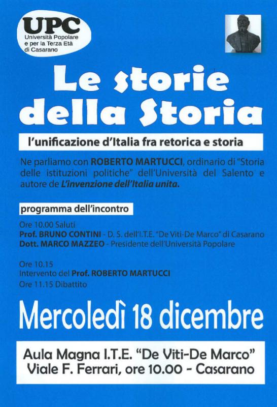 L'unificazione d'Italia fra retorica e storia. Ne parliamo con ROBERTO MARTUCCI, ordinario di "Storia delle Istituzioni politiche" dell'Università del Salento e autore del L'invenzione dell'Italia unita. Mercoledì 18 Dicembre - Ore 10:00
