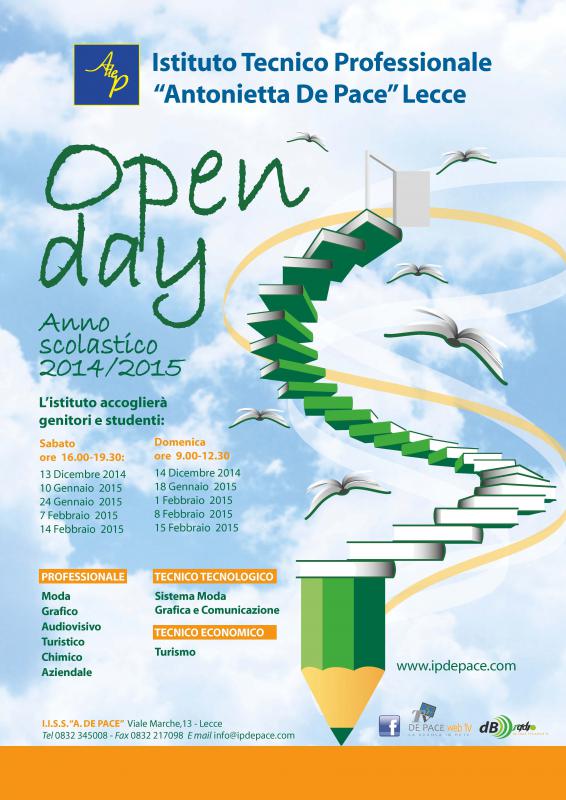 Pubblicate sul nostro nuovo sito scolastico www.ipdepace.com le date per l'Open Day dell'a.s.2014/2015. Vieni a scoprire la nostra scuola e le sue opportunità. Ti aspettiamo!