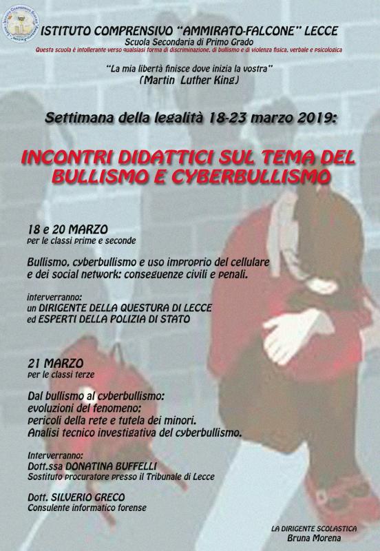 L’I.C., così come programmato nel POF 2018/2019 e nel PTOF d’Istituto del triennio, da sempre sensibile alle tematiche della legalità, del bullismo e del cyber bullismo, all’interno delle attività didattiche e formative di cittadinanza e costituzione, ha organizzato per tutti gli alunni e le alunne una settimana di sensibilizzazione sulle tematiche della Legalità
