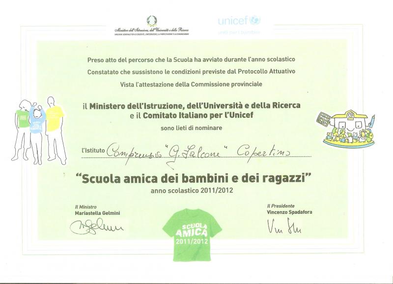 Preso atto del percorso che la Scuola ha avviato durante l'anno scolastico, constatato che sussistono le condizioni previste dal Protocollo Attuativo e vista l'attestazione della Commissione provinciale il Ministero dell'Istruzione, dell'Università e della Ricerca e il Comitato Italiano per l'Unicef hanno nominato il nostro Istituto "Scuola Amica dei Bambini e dei Ragazzi" per l'a.s. 2011/2012