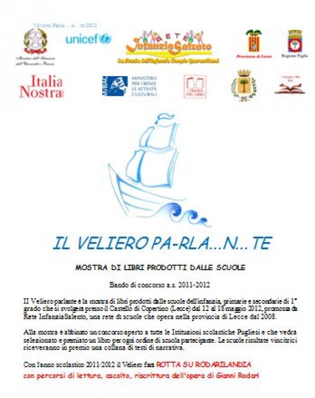 Mostra di libri prodotti dalle scuole. Edizione 2012! Il Concorso si realizza, per il corrente anno scolastico, in collaborazione con il Ministero dell’Istruzione, dell’Università e della Ricerca – Direzione Generale per lo Studente e con il patrocinio della Regione Puglia e vedrà gli alunni impegnati in percorsi di lettura, ascolto, riscrittura dell’opera di Gianni Rodari. Le scuole che intendono partecipare alla mostra potranno prenotarsi inoltrando all’indirizzo e-mail: velieroparlante.info@gmail.com, entro il 30 novembre 2011, il modulo di iscrizione indicando le sezioni di interesse,mentre entro il 30 marzo 2012, gli elaborati realizzati a: Concorso Regionale “Il Veliero parla…n…te” Istituto Comprensivo n.4 - Giovanni Falcone Via Regina Isabella 73043 Copertino, Lecce