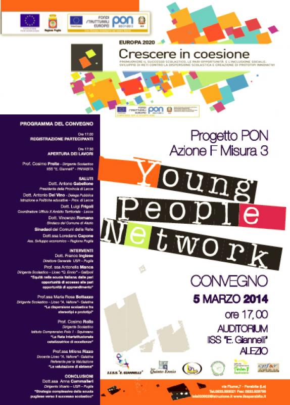 Mercoledì 5 marzo, alle ore 17:00, presso l'auditorium dell'IISS "E. Giannelli" di Alezio, si svolgerà un Convegno tematico per l'avvio del Progetto “Young People Network”. Dopo l'apertura dei lavori, a cura del Dirigente scolastico dell'IISS "E. Giannelli" interverranno: - Franco Inglese - Direttore Generale USR-Puglia, - Anna Cammalleri - Dirigente Vicario USR Puglia, - Antonio Gabellone - Presidente Provincia di Lecce, - Antonella Manca – D.S. Liceo Q. Ennio, - Maria Rosaria Bottazzo – D.S. Liceo “A. Vallone”, - Cosimo Rollo – D.S. dell'I. C.di Squinzano - Milena Rizzo – Docente Liceo “A. Vallone”- Referente per la Valutazione del progetto F3.