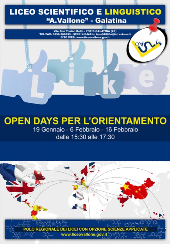 Si svolgerà domenica 16 febbraio, a partire dalle 15:30, il terzo OPEN DAY per l'orientamento del nostro Liceo: accoglieremo alunni della Scuola Secondaria di primo grado e famiglie per far conoscere il nostro Istituto. Nel corso del pomeriggio, riserveremo uno spazio alla premiazione delle eccellenze. Saranno consegnate due borse di studio intitolate a "Tundo-Vallone" agli studenti: Gianmarco Gabrieli della classe 5^A e Francesco Mengoli della 5^D. Gli incentivi erogati dal MIUR, ai sensi del D.Lgs.VO 29 dicembre 2007 n° 262, saranno consegnati a tre studenti che, conseguendo la votazione di CENTO e LODE agli Esami di Stato, sono stati inseriti nell'ALBO NAZIONALE delle ECCELLENZE: Stefano Cordella, Guido Raffaele e Maria Grazia Mele.