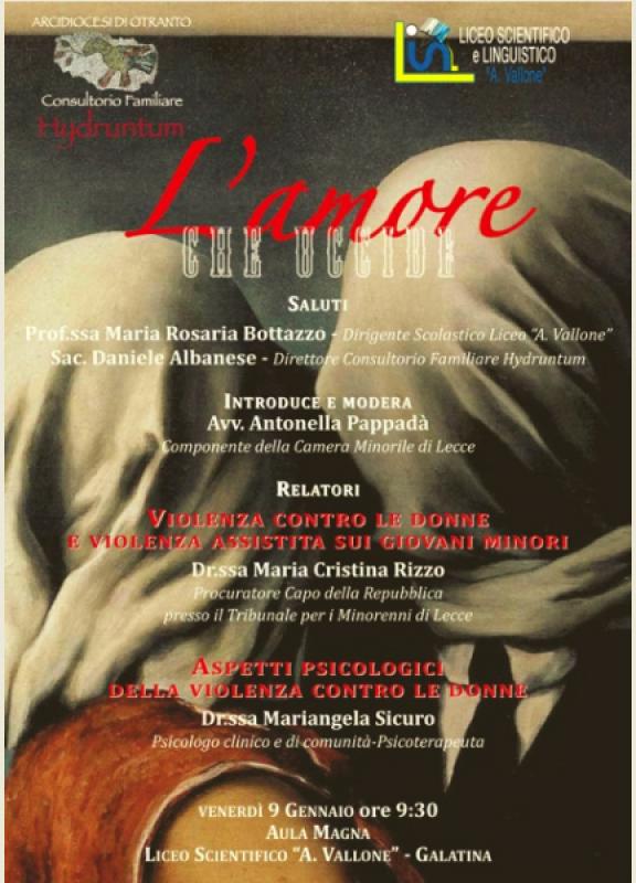 Su proposta di Don Daniele Albanese - Direttore del Consultorio Familiare Hydruntum, venerdì 9 gennaio p.v., alle ore 9:30, nell'auditorium del nostro Liceo, avrà luogo l'incontro "L'AMORE CHE UCCIDE", riservato agli studenti delle classi terze. I relatori tratteranno da più angolature le problematiche connesse alla violenza contro le donne. Introduce e modera: Antonella Pappadà - Avvocato componente della Camera minorile di Lecce Intervengono: Maria Cristina Rizzo - Procuratore Capo della Repubblica presso il Tribunale dei minori di Lecce Mariangela Sicuro - Psicologo clinico e psicoterapeuta.