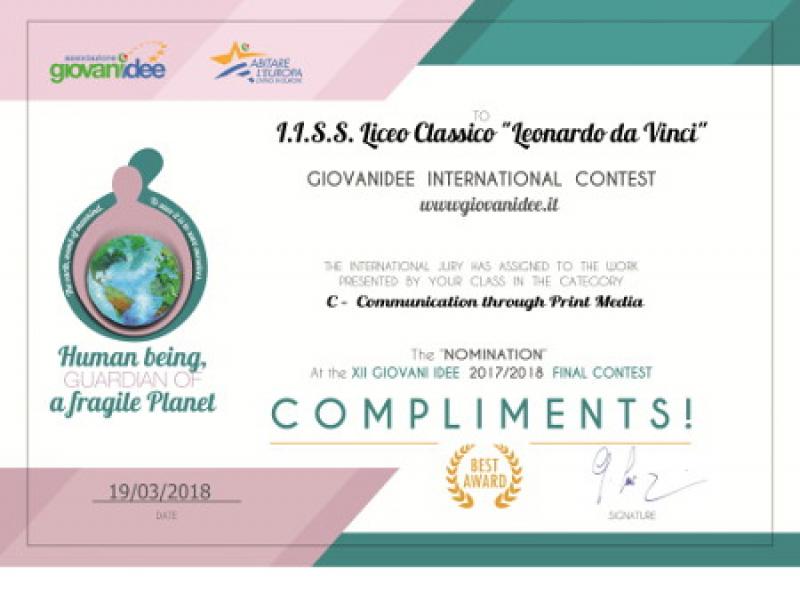 La classe III A del Liceo Classico ha sbaragliato la concorrenza di molte scuole europee ed entra nella finale del Concorso GIOVANI IDEE. “Uomo, custode di un Pianeta fragile” il tema fissato per l‘edizione 2017/18 aperta a scuole italiane e non. Gli alunni della III A hanno scelto, fra le quattro sezioni del concorso, un prodotto che appare quasi desueto ormai: un giornale cartaceo. Hanno discusso, fatto ricerche, incontrato esperti del territorio, pensato e confezionato una rivista che, partendo dalle emergenze ambientali cittadine, offre una lettura  dal locale al globale, delle questioni ambientali più urgenti, terminando con un impegno solenne al cambiamento. La finale di svolgerà nei giorni 27 e 28 aprile 2018 a Kaposvar, in Ungheria.