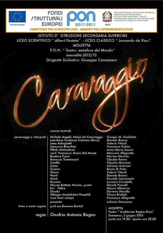 Si è svolta il 2 giugno 2013 la rappresentazione teatrale in oggetto, frutto dell'attività P.O.N. “Teatro: metafora del mondo” annualità 2012-2013 In scena gli alunni del Liceo Scientifico e del Liceo Classico, diretti dal prof. A.Ragno e dalla prof.ssa D.Bartoli, per rappresentare l’azione teatrale “Caravaggio” sulla vita e le opere di uno dei più celebri pittori italiani di tutti i tempi.