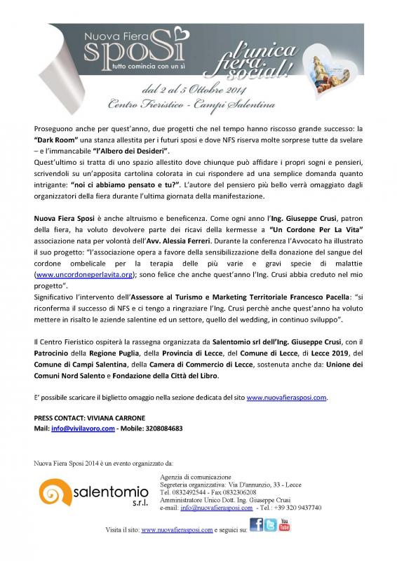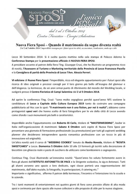 Dopo il successo degli anni passati e delle scorse edizioni di “NUOVA FIERA SPOSI”, si ripete anche quest’anno l’esperienza di una fiera dedicata al matrimonio a 360°, ancora più ricca di sorprese e novità. La manifestazione fieristica è finalizzata a proporre le nuove mode e tendenze del settore del matrimonio e ad apportare visibilità a tutte quelle aziende salentine piccole e medie, di tipologia sia artigianale che commerciale che operano nella filiera dell’organizzazione matrimoniale. Nuova Fiera Sposi (www.nuovafierasposi.com) darà nuovamente vita, dal 2 al 5 Ottobre 2014, a un vero e proprio interscambio, non solo commerciale ma “emozionale”, tra espositori e visitatori.