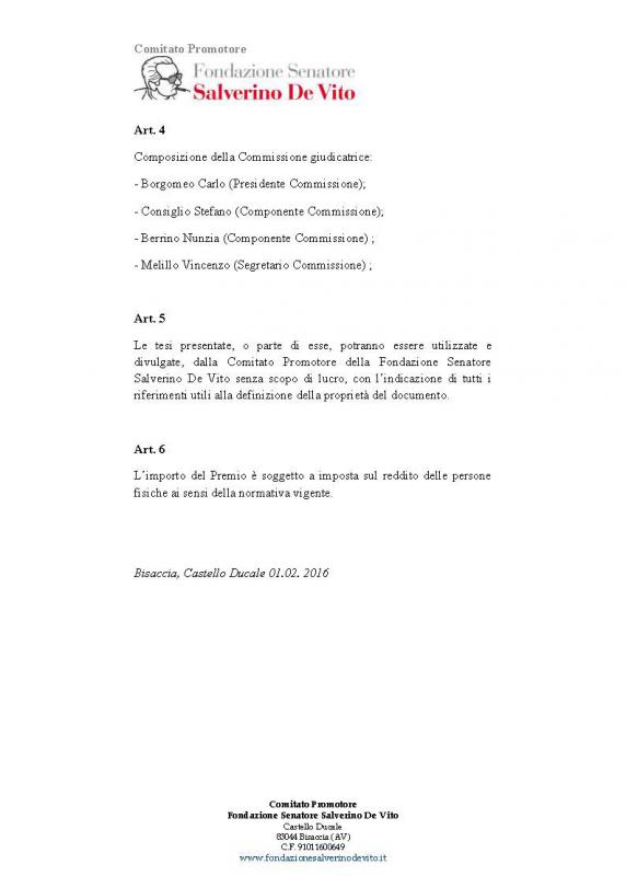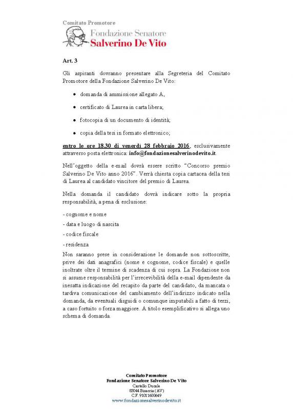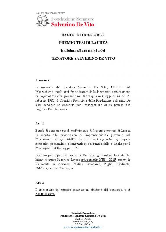 In memoria del Senatore Salverino De Vito, Ministro Del Mezzogiorno negli anni 80 e ideatore della legge per la promozione di Imprenditorialità giovanile nel Mezzogiorno, il Comitato Promotore della Fondazione Salverino De Vito bandisce un concorso per l’assegnazione di un premio alla migliore Tesi di Laurea. La tesi dovrà riguardare gli aspetti normativi, economici e d’innovazione nel quadro delle politiche per il Mezzogiorno della Legge n. 44. Possono partecipare al Bando di Concorso gli studenti laureati che hanno discusso la tesi di Laurea nel periodo 1986 - 2015 presso le Università di Abruzzo, Molise, Campania, Puglia, Basilicata, Calabria, Sicilia e Sardegna. Scadenza 28/02/2016 ore 18.30 Info su www.unisalento.it