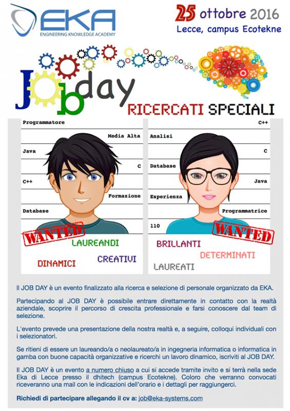 Eka organizza il secondo Job day. L'evento mira a metterci in contatto con giovani neolaureati o laureandi in ingegneria informatica o informatica brillanti e dinamici. Se ritieni di essere pronto a cogliere le sfide che il mondo del lavoro ti pone, se vuoi entrare in una realtà giovane e in costante crescita, chiedi di partecipare al job day inviando il tuo cv a job@eka-systems.com, se sarai selezionato sarai invitato a partecipare. L'evento è a numero chiuso e si svolgerà il 25 Ottobre presso la sede Eka sita nell'edificio Dhitech, campus universitario Ecotekne, Lecce.