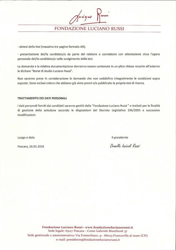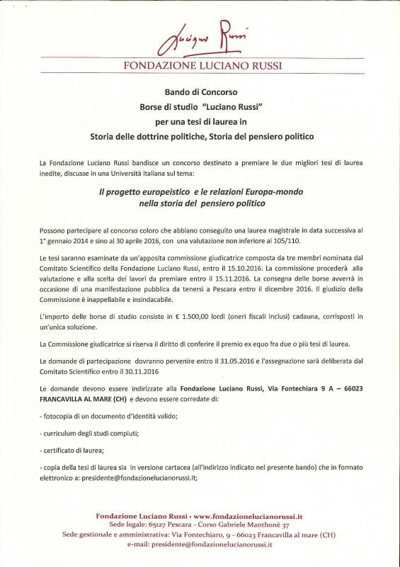 La Fondazione Luciano Russi, nata allo scopo di conservare e diffondere l’eredità culturale dello storico del Pensiero Politico, già rettore dell’Università degli Studi di Teramo, nell’ambito delle proprie attività istituzionali, ha promosso un Bando di Concorso per l’assegnazione di borse di studio per tesi di laurea riconducibili al tema: "Il progetto europeistico e le relazioni Europa-mondo nella storia del pensiero politico". Scadenza: 31/05/2016