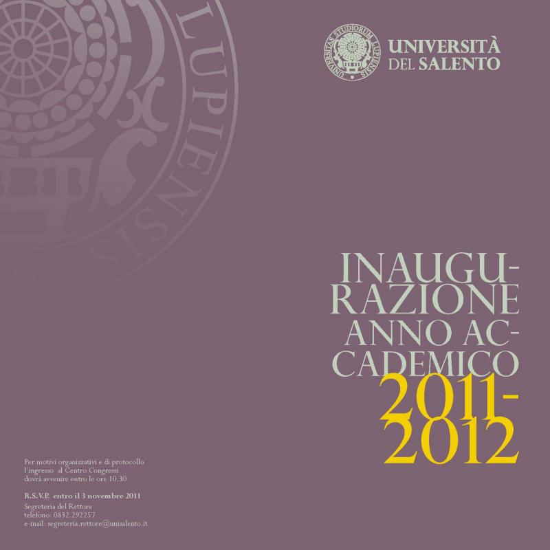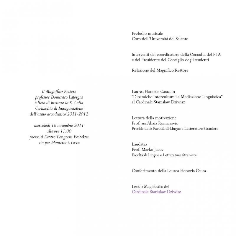 Messaggio del Magnifico Rettore Cari colleghi, studenti e personale, il prossimo 16 novembre inaugureremo ufficialmente l’Anno Accademico 2011-2012. L’appuntamento è per le ore 11 presso la Sala congressi del complesso Ecotekne, con una cerimonia all’interno della quale conferiremo la laurea honoris causa in “Dinamiche Interculturali e Mediazione Linguistica” al Cardinale Stanislaw Dziwisz, segretario particolare di Sua Santità Giovanni Paolo II. Per motivi organizzativi e di protocollo l’ingresso al Centro Congressi dovrà avvenire entro le ore 10.30. Cari saluti Domenico Laforgia