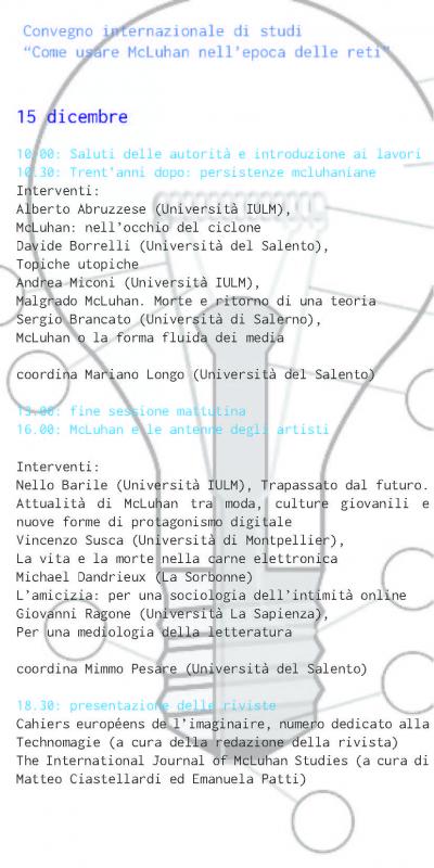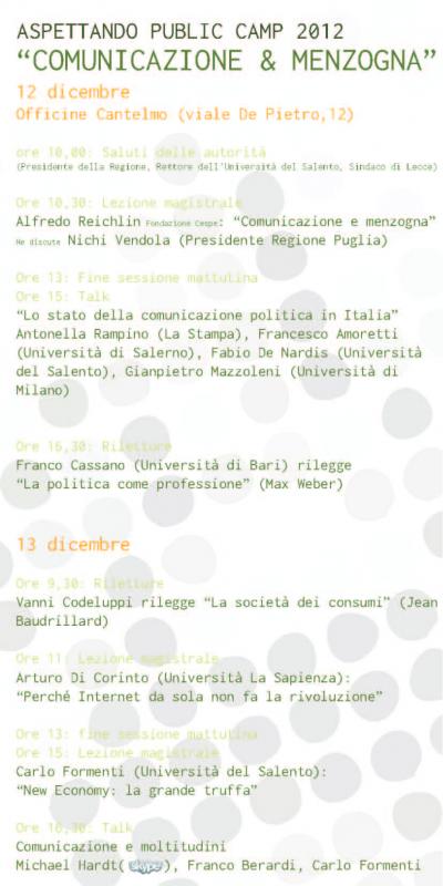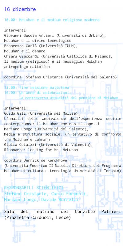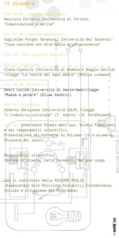 Dopo un articolato programma di incontri, presentazioni di libri, proiezioni cinematografiche e convegni, si chiudono le celebrazioni per il decennale del corso di laurea in Scienze della Comunicazione dell’Università del Salento. A Lecce da lunedì 12 a venerdì 16 dicembre 2011 le Officine Cantelmo, il Monastero delle Benedettine e il Convitto Palmieri ospitano cinque giorni di incontri e convegni organizzati con il contributo della Regione Puglia (Assessorato alle Politiche giovanili, cittadinanza sociale e attuazione del programma) e con il patrocinio dell’Ordine dei Giornalisti della Puglia.