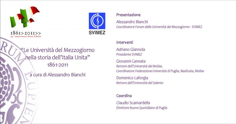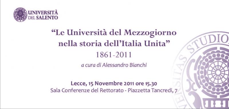 "Le Università del Mezzogiorno nella storia dell'Italia Unita (1861-2011)" Verrà presentato martedì 15 novembre 2011, alle ore 15.30 nella sala conferenze del Rettorato, il volume “Le Università del Mezzogiorno nella storia dell’Italia Unita (1861-2011)”, a cura di Alessandro Bianchi (edizioni Il Mulino).