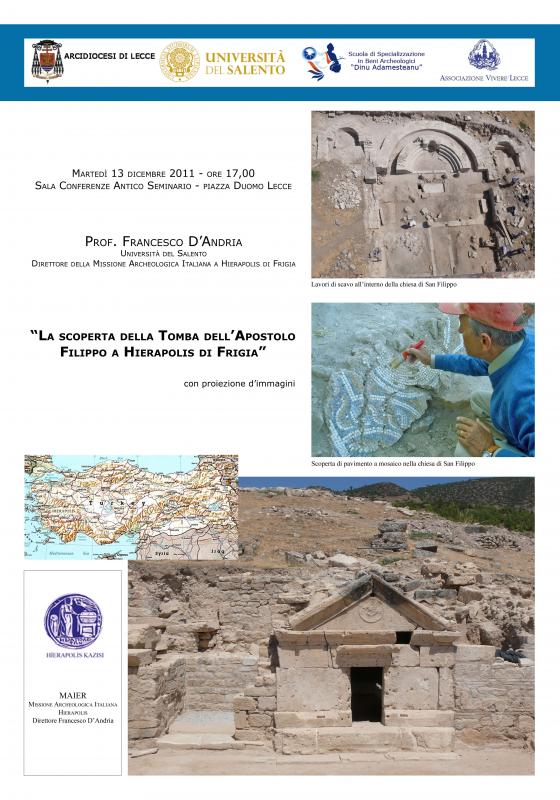 Martedì 13 dicembre alle ore 17,00, presso la Sala Conferenze dell'Antico Seminario in piazza Duomo a Lecce, il prof. Francesco D'Andria, Direttore della Scuola di Specializzazione in Beni Archeologici "Dinu Adamesteanu", terrà una conferenza dal titolo "La scoperta della Tomba dell'Apostolo Filippo a Hierapolis di Frigia".