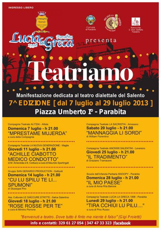 Luglio 2013 è ricco di eventi a Parabita con la 7^ Edizione di TEATRIAMO dal 7 luglio al 29 luglio 2013 Piazza Umberto I a Parabita Manifestazione dedicata al teatro dialettale nel Salento